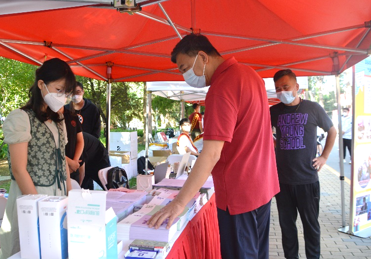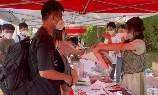 太阳初升,新生同学陆续来到展位前,防疫消毒、核对信息、领取物资、办理手续……虽全程佩戴口罩,但难掩激动之情。