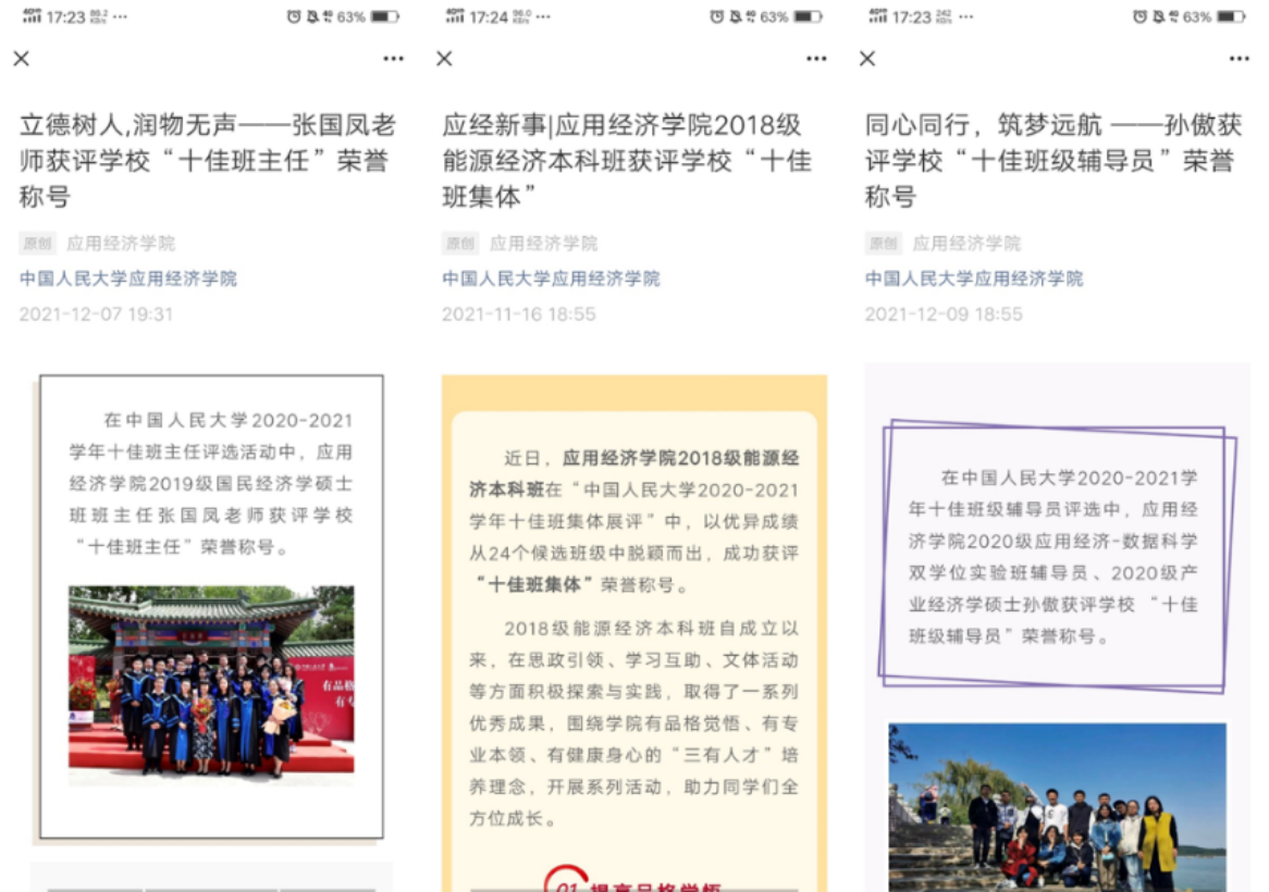 在太阳成tyc122cc集团2020-2021学年“十佳班集体”、“十佳班主任”、“十佳辅导员”等一系列三班建设评选活动中,太阳成tyc122cc集团表现突出,屡获佳绩。2019级国民经济硕士班主任张国凤老师获评公司“十佳班主任”荣誉称号;2018级能源经济本科班荣获“十佳班集体”荣誉称号;2020级应用经济-数据科学双学位实验班辅导员孙傲同学获评“十佳班级辅导员”荣誉称号。