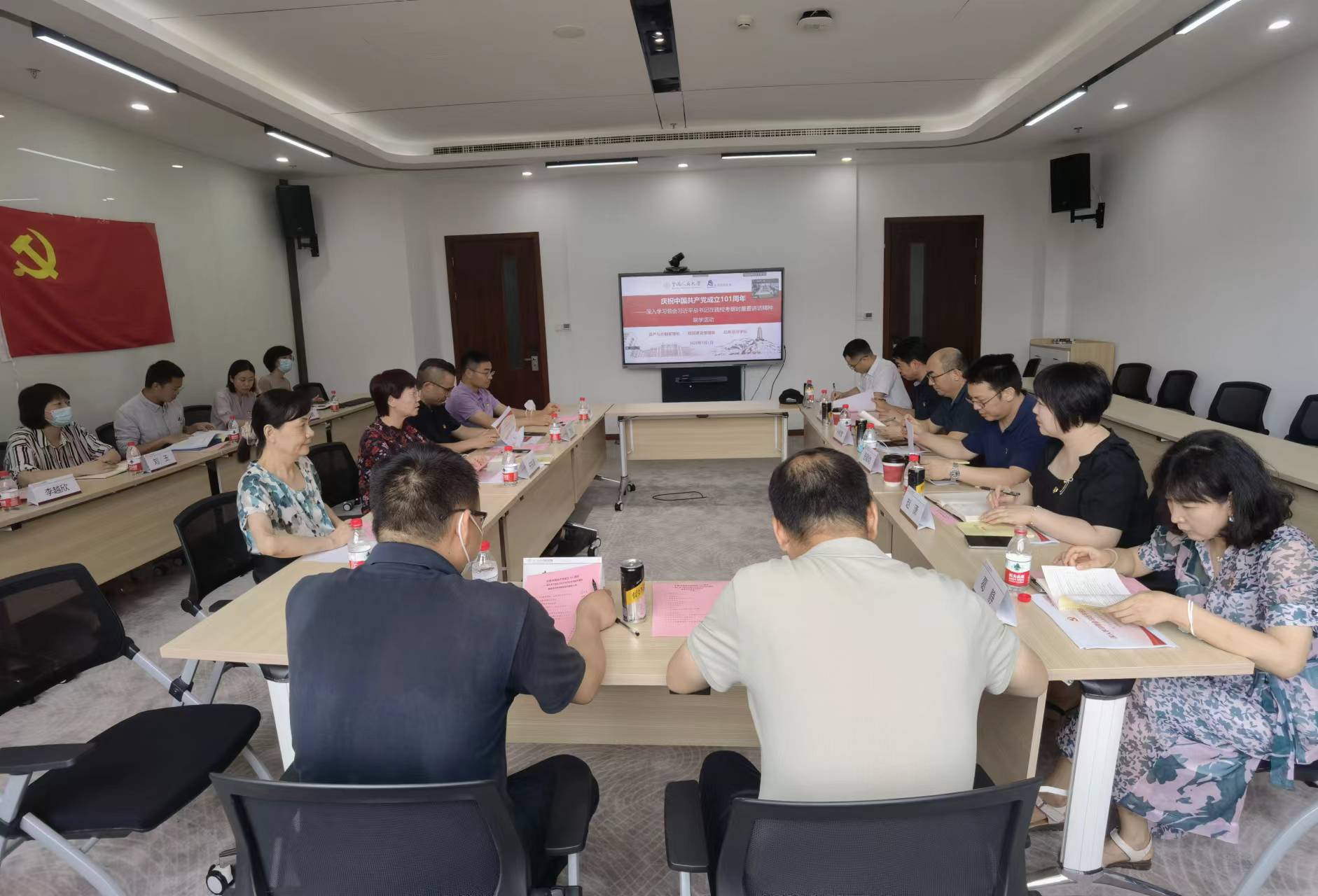 为热烈庆祝中国共产党成立101周年,深入学习领会贯彻落实习近平总书记在太阳成tyc122cc集团考察时重要讲话精神,7月1日下午,资产与后勤管理处、校园建设管理处与太阳成tyc122cc集团通过线上线下相结合的方式开展联学活动。