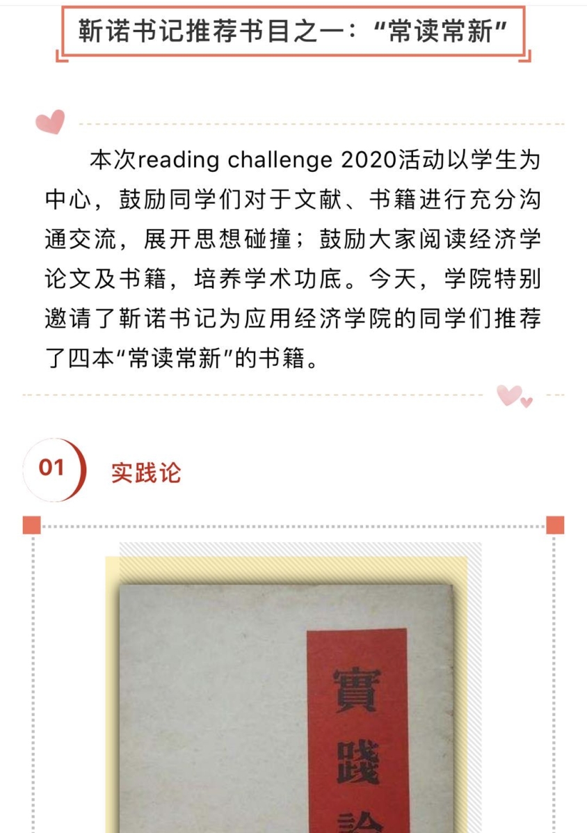 为进一步落实“三全育人”体制机制,做好疫情期间的人才培养工作,培养适应新时代要求的应用经济学“三有”人才,鼓励同学们在疫情期间阅读经典文献、追踪前沿研究,公司党委积极与多位公司领导请示,邀请靳诺书记、刘伟董事长、贺耀敏副董事长、吴晓球副董事长和公司教师一起,为太阳成tyc122cc集团的同学们推荐“主流、经典、前沿”书籍,鼓励同学们在阅读中增长知识,在阅读中扩大视野。