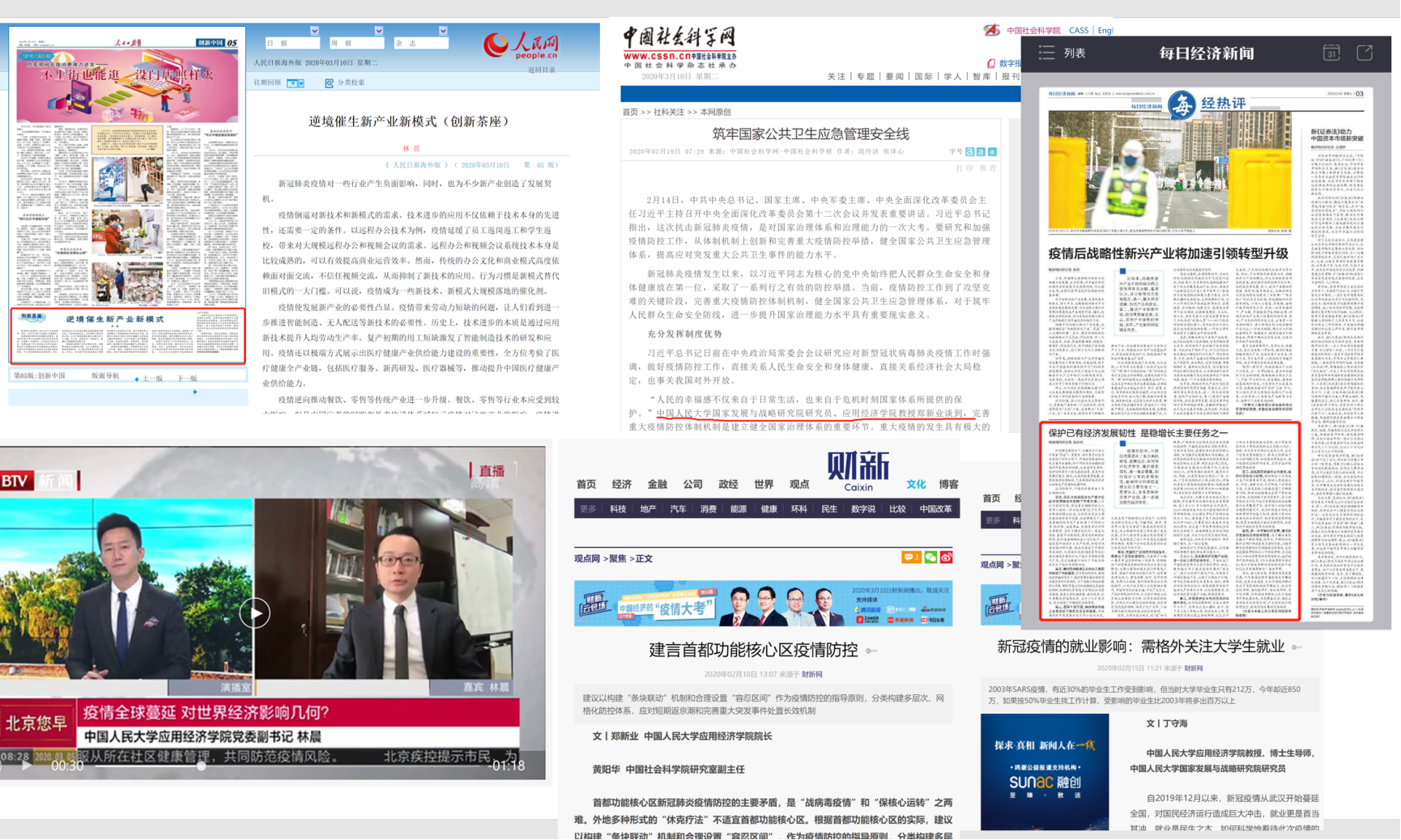 郑新业、丁守海、姚永玲、林晨等多位老师通过公开发表疫情相关文章、接受媒体访谈等形式,对民众十分关切的疫情对经济发展、就业影响等话题予以解答,人民日报(海外版)、人民网专刊、中国社科报、每日经济新闻、财新网和北京电视等媒体对相关观点进行了专门报道。