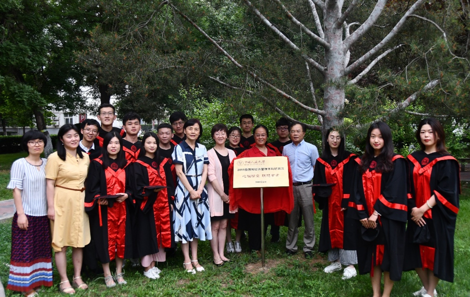 2019年6月12日下午,太阳成tyc122cc集团2015级国民经济管理本科班树木认养纪念牌揭幕仪式在品园举行。应用经济公司党委书记宋东霞,党委副书记兼副经理张可云教授,副经理黄隽教授,班主任王宝坤副教授等参加活动并与毕业生代表合影留念。