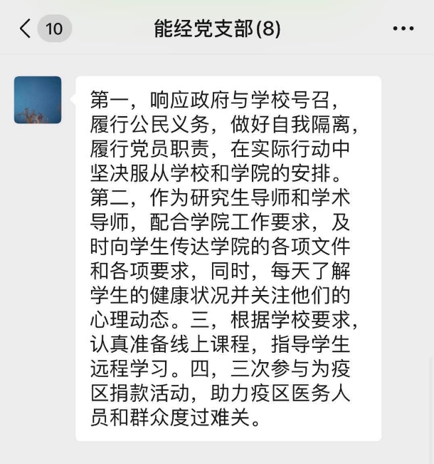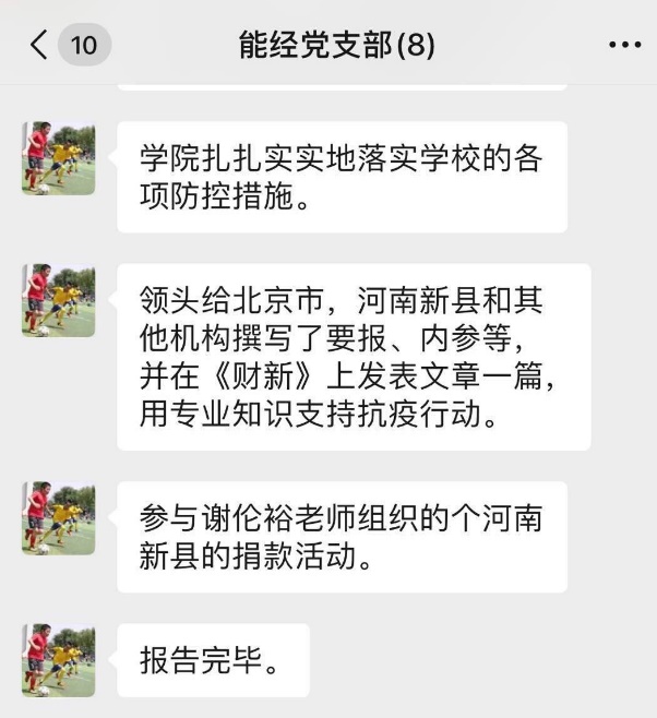 河南新县是公司可持续发展课题组的重要教学与科研基地,受本次疫情影响十分严重。支部郑新业同志、谢伦裕同志充分发挥智囊作用,先后多次到新县调研,与老区人民结下了深厚的友谊,积极号召课题组师生,为河南新县献爱心,支部多名教师参与此次捐款活动。支部党员同志还积极为北京市和河南新县等单位撰写要报、内参,以专业知识支持抗疫行动。