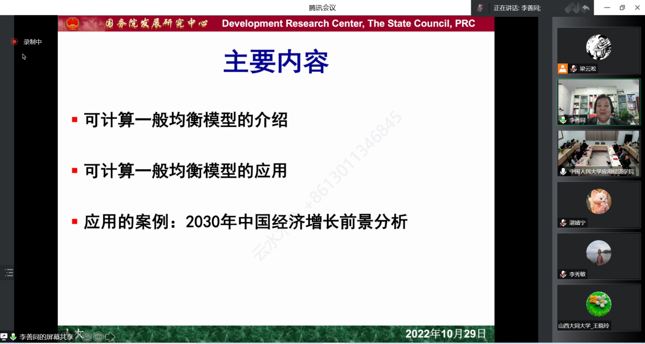 李善同以“DRCCGE模型的应用”为主题展开报告。她对CGE模型做了历史总结,并重点介绍国务院发展研究中心与OECD合作开发的DRCCGE模型的特点、更新扩展,以及近年来在重大事件中的应用。
