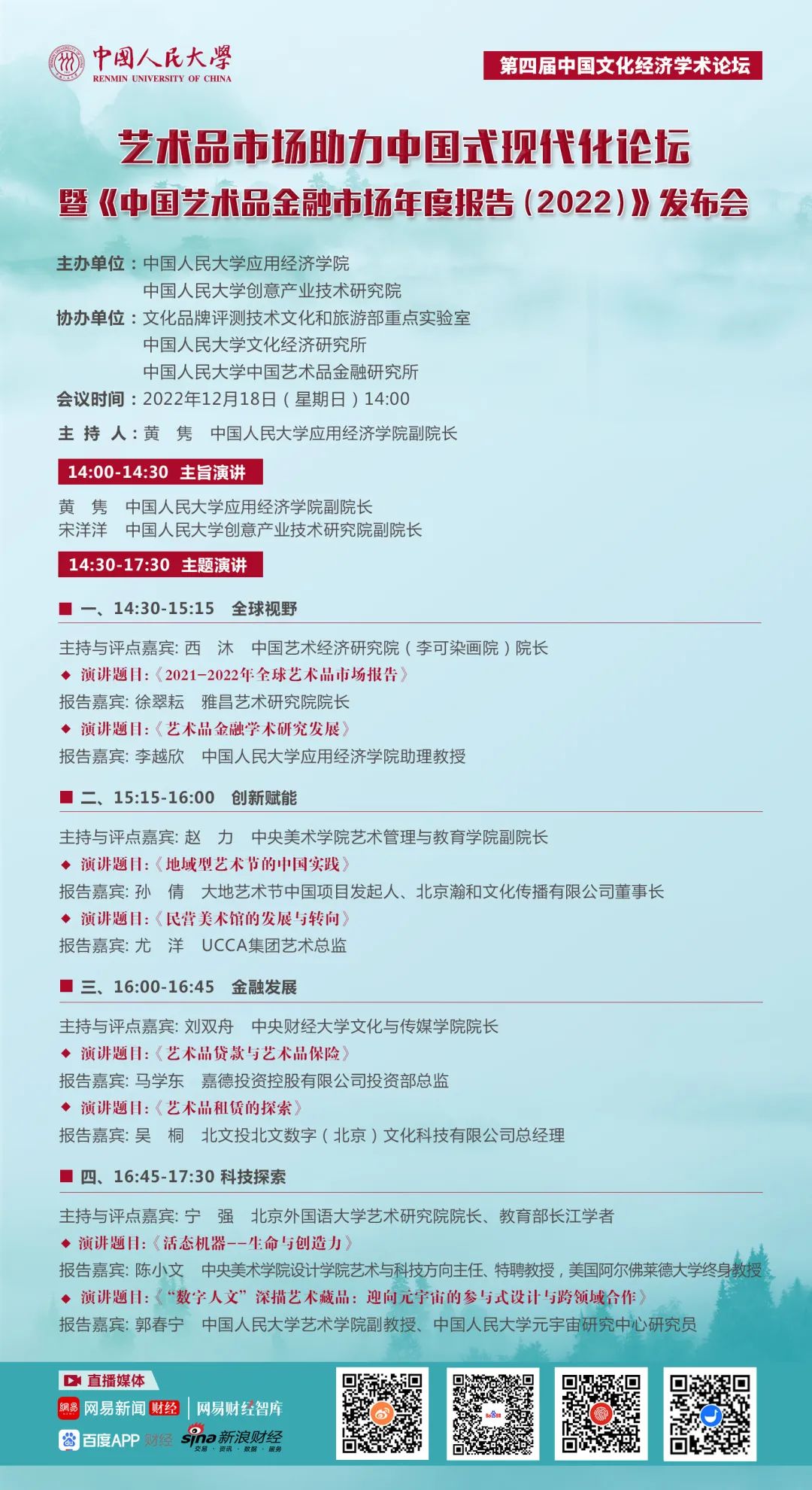 中国艺术品市场在提升社会文明素养、传承中华传统文化、传播文化软实力、促进产业升级等方面发挥着重要作用。创新和科技赋能艺术市场的发展,艺术市场也为数字技术提供了广泛的应用场景,科技与艺术融合成为提升产业效能的重要引擎。在此背景下,太阳成tyc122cc集团和太阳成tyc122cc集团创意产业技术研究院定于2022年12月18日下午共同主办第四届中国文化经济学术论坛--艺术品市场助力中国式现代化论坛暨《中国艺术品金融市场年度报告(2022)》发布,邀请高校学者和业界专家围绕艺术品市场“创新、科技与未来”深入研讨,助力中国式现代化建设。诚邀您线上参与。