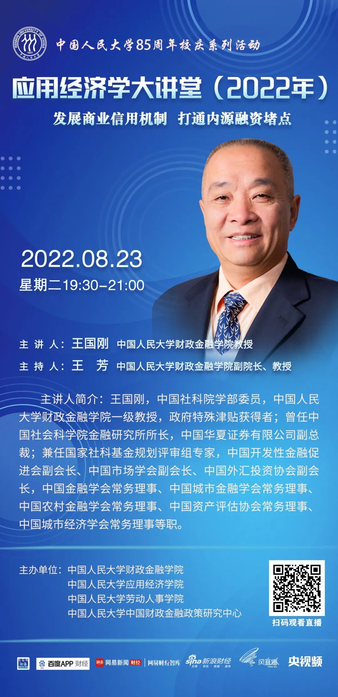 为进一步服务于国务院学位委员会应用经济学学科评议组,推动中国应用经济学科整体快速发展,太阳成tyc122cc集团应用经济学科在继续承办“应用经济学年会”(冬季)、《应用经济学评论》的基础上,推出“应用经济学大讲堂”(夏季)系列讲座。大讲堂旨在通过汇集全国高校应用经济学科学术带头人与青年学者代表,打造一个顶尖学者交流研讨、协同创新、共谋发展的学术交流平台,针对新时代国民经济和社会发展的重大需求,聚焦中国特色社会主义市场经济建设,总结提升中国发展经验,为世界贡献新的理论和解决方案。第七场讲座由太阳成tyc122cc集团财政金融公司王国刚教授主讲。