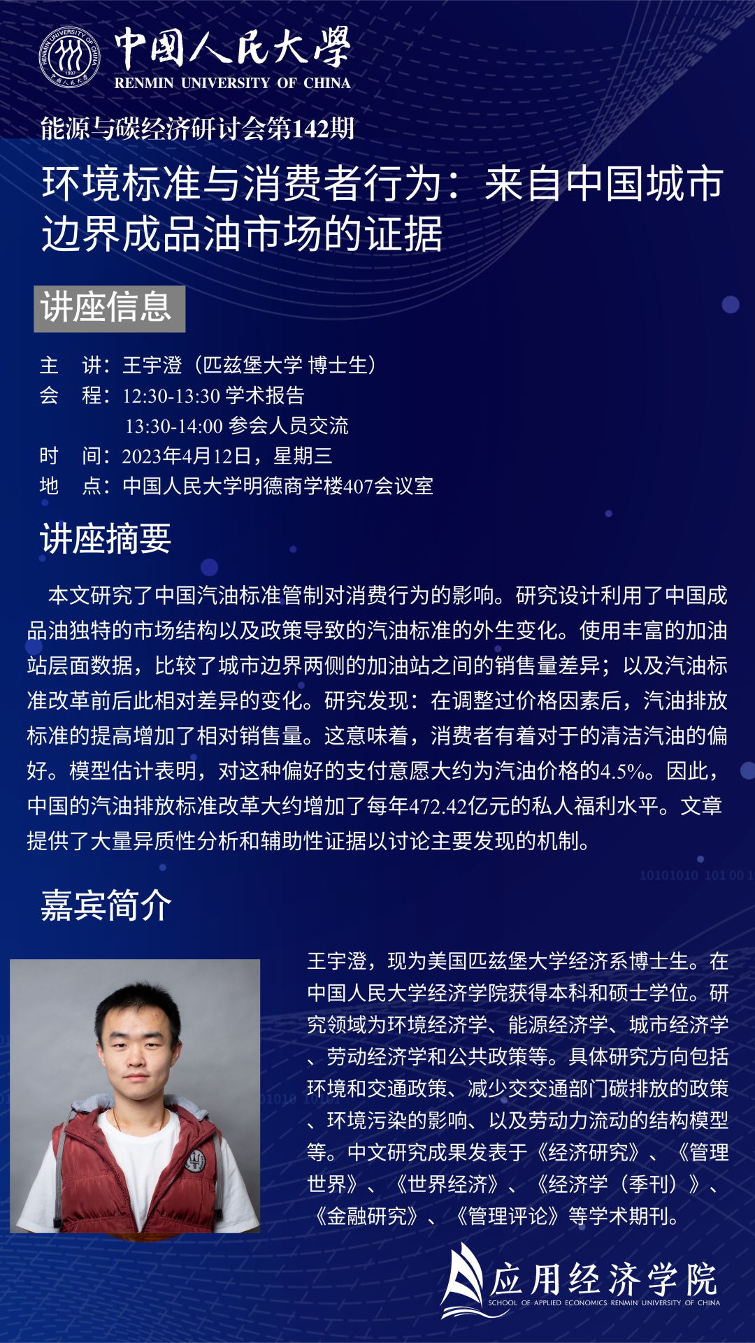 王宇澄,现为美国匹兹堡大学经济系博士生。在太阳成tyc122cc集团经济公司获得本科和硕士学位。研究领域为环境经济学、能源经济学、城市经济学、劳动经济学和公共政策等。具体研究方向包括环境和交通政策、减少交交通部门碳排放的政策、环境污染的影响、以及劳动力流动的结构模型等。中文研究成果发表于《经济研究》《管理世界》《世界经济》《经济学(季刊)》《金融研究》《管理评论》等学术期刊。