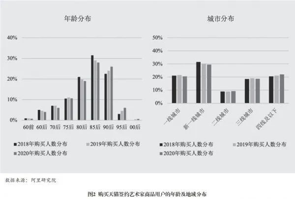 从2020年天猫线上搜索和消费视角,我们可以从一个侧面来观察艺术需求的特征。从用户的年龄分布可以看出,80后、90后成为关注和购买艺术品的主力军(如图1)。生长在改革开放时期的年轻人对情感和浪漫的需求不仅远远高于他们的父辈,且更为注重创新、享受和体验,艺术消费成为其较为刚性的需求;同时,新一线城市的艺术品消费人数异军突起,三四线城市也颇具消费发展潜力(如图2)。