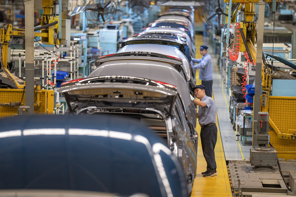 Staff work on the production line of new energy vehicles at a workshop of Haima Motor in Haikou, China, October 11, 2022./CFP