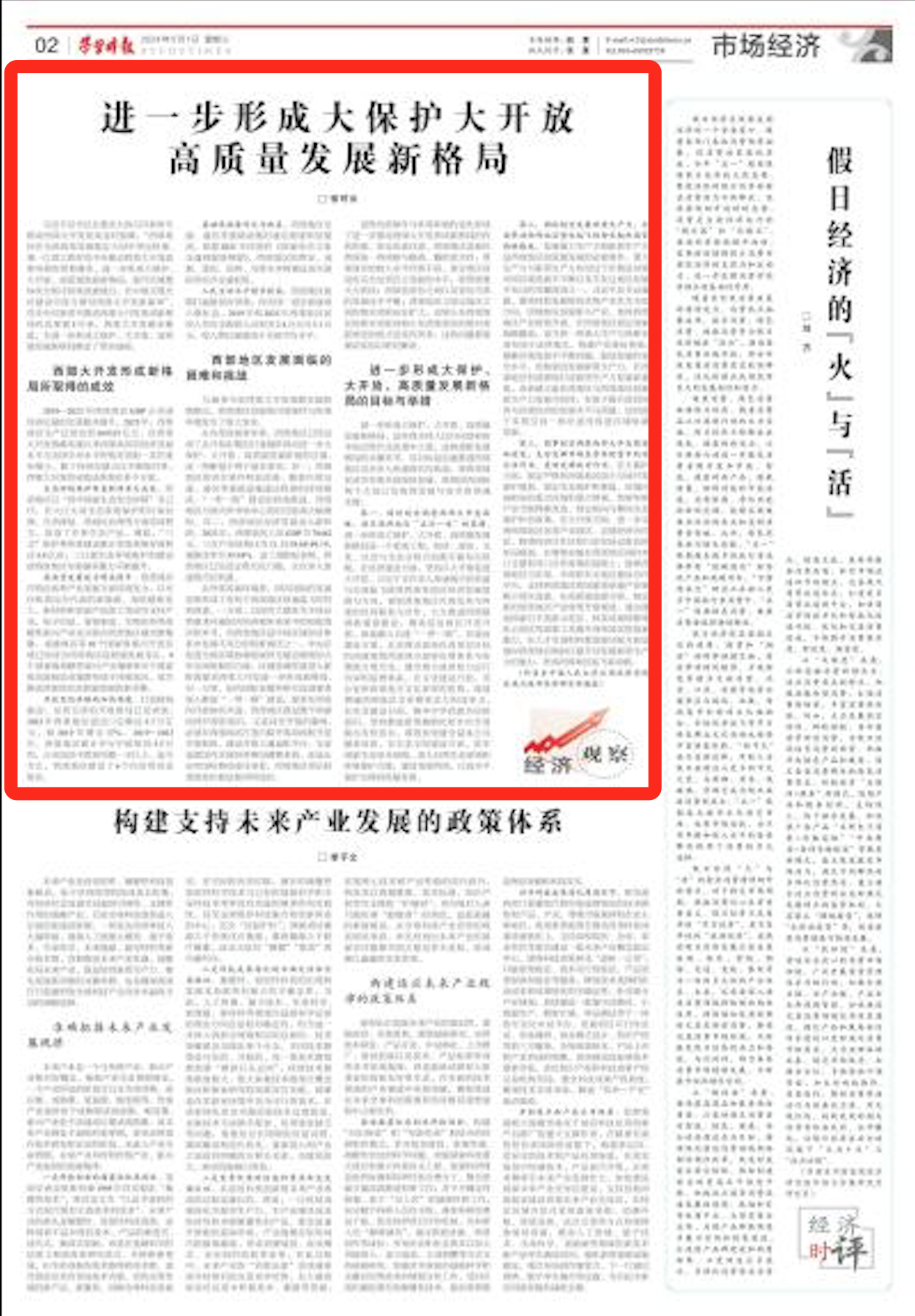 习近平总书记在重庆主持召开新时代推动西部大开发座谈会时强调,“西部地区在全国改革发展稳定大局中举足轻重。要一以贯之抓好党中央推动西部大开发政策举措的贯彻落实,进一步形成大保护、大开放、高质量发展新格局,提升区域整体实力和可持续发展能力,在中国式现代化建设中奋力谱写西部大开发新篇章”。党中央对新时代推动西部大开发形成新格局作出部署5年来,西部大开发稳步推进,为进一步形成大保护、大开放、高质量发展新格局奠定了坚实基础。