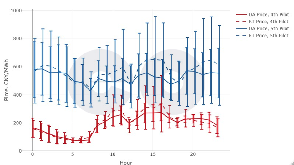 图3展示了日前市场(DA)以及实时市场(RT)各小时的平均现货价格,以及试运行期间价格的波动情况(垂直长条代表标准差)。可见,第五轮现货市场价格波动比第四轮更大,实时现货市场价格波动比日前市场更大。这也就意味着对于零售商来说,第五轮的交易风险比第四轮更高,同时实时市场的交易风险比日前市场更高。