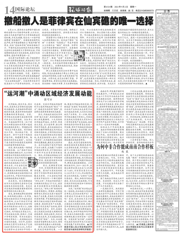 其次,内陆地区通过运河网实现“通江达海”,更好地服务和融入新发展格局。六大省份的内河航运开通后,北部湾、粤港澳大湾区、长江经济带、除山西外的中部地区,甚至成渝地区双城经济圈等都将通过内河航运网络实现联通,方便内陆省份通过运河直接把货物运到全国各地,或者直接送到入海口,实现“沿海化”,从而能够承接沿海经济的发展辐射,激发更大经济活力。这不仅密切了国内市场的产业分工联系,还拓展了与国际市场的经贸合作,对于推进高水平对外开放具有重要战略意义。因此,内河航运网络成为用好国内国际两个市场两种资源、促进国内国际双循环的重要桥梁和纽带。