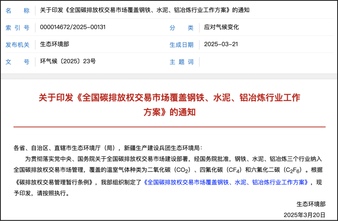 近日,生态环境部发布《全国碳排放权交易市场覆盖钢铁、水泥、铝冶炼行业工作方案》(以下简称《方案》),提出按照“边实施、边完善”的工作思路,分两个阶段做好钢铁、水泥、铝冶炼行业纳入全国碳排放权交易市场相关工作: