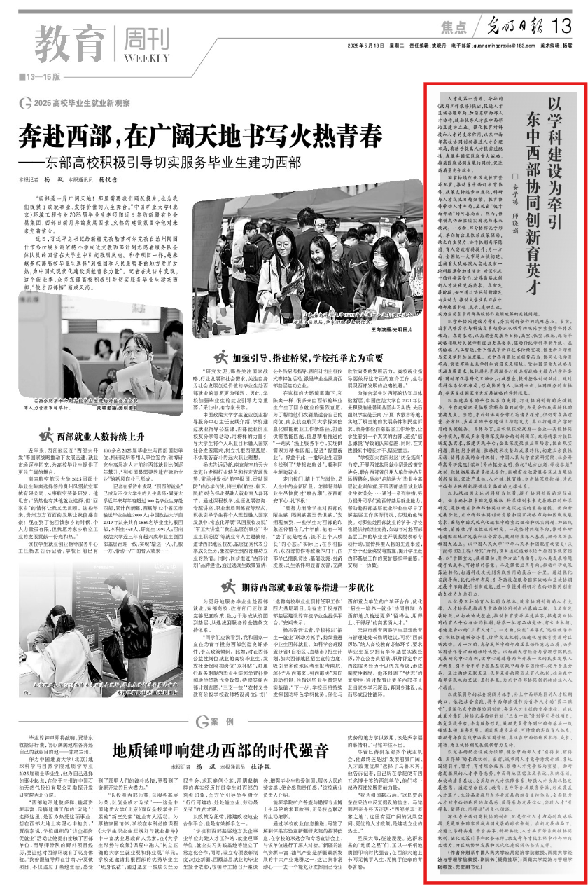 深化东中西部高校协同创新,既是优化人才布局的战略举措,更是服务国家区域协调发展的时代命题。在新发展格局下,应通过学科共建、平台共享、科研共进、人才共育等系统性协同机制,强化政策引导和配套保障,激发青年才俊扎根中西部的内生动力,为区域协调发展和现代化建设提供坚实支撑。