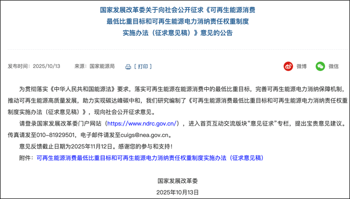 国家发展改革委日前发布《可再生能源消费最低比重目标和可再生能源电力消纳责任权重制度实施办法(征求意见稿)》,向社会公开征求意见。《征求意见稿》显示,将以该办法的原则,对能源用户可再生能源消费最低比重目标和省级行政区域可再生能源电力消纳责任权重的制定、监测和考核。