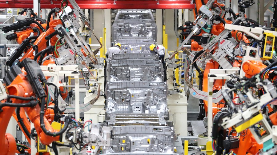 Robots conduct welding work at the workshop of an automobile manufacturing factory in Qingdao, east China's Shandong Province, January 14, 2023. /Xinhua