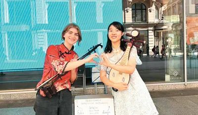 在为莱比锡中国音乐节排练时,我遇到了一名正在学习二胡的德国女孩——明月(Maricel Wetzel)。她对中国乐器和文化很有兴趣,尤其对二胡情有独钟。我们一见如故,聊得格外开心。明月对我说,她第一次听到二胡演奏时,就被优美、舒缓的旋律深深打动。此后,她开始学习二胡,每周坚持练习。在音乐节排练结束后,我们一拍即合,决定一起走上德国的城市街头,合奏二胡与柳琴。