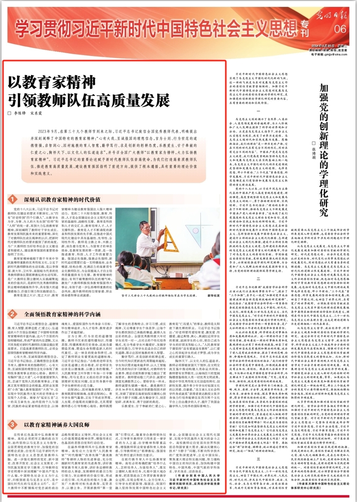2023年9月,在第三十九个教师节到来之际,习近平总书记致信全国优秀教师代表,明确提出并深刻阐释了中国特有的教育家精神:“心有大我、至诚报国的理想信念,言为士则、行为世范的道德情操,启智润心、因材施教的育人智慧,勤学笃行、求是创新的躬耕态度,乐教爱生、甘于奉献的仁爱之心,胸怀天下、以文化人的弘道追求”,并号召全国广大教师“以教育家为榜样,大力弘扬教育家精神”。习近平总书记的重要论述赋予新时代教师队伍崇高使命,为我们打造高素质教师队伍、推进教育高质量发展、建设教育强国指明了前进方向,提供了根本遵循,具有重要的理论价值和实践意义。