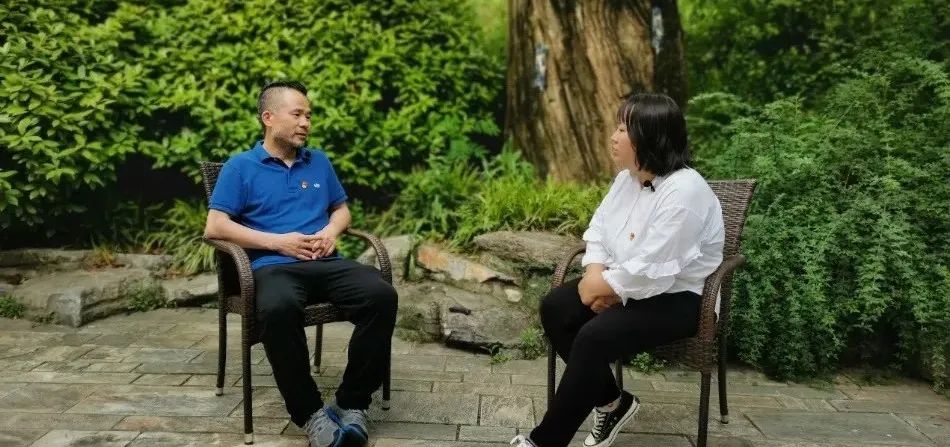 8月17日,在贵州省铜仁市,访谈团师生和在万山区谢桥街道牙溪村驻村锻炼2022届劳动人事公司员工陈继淮、在市委社会工作部工作的2019届商公司员工杨琳锋交流了在基层驻村工作的心得感悟。