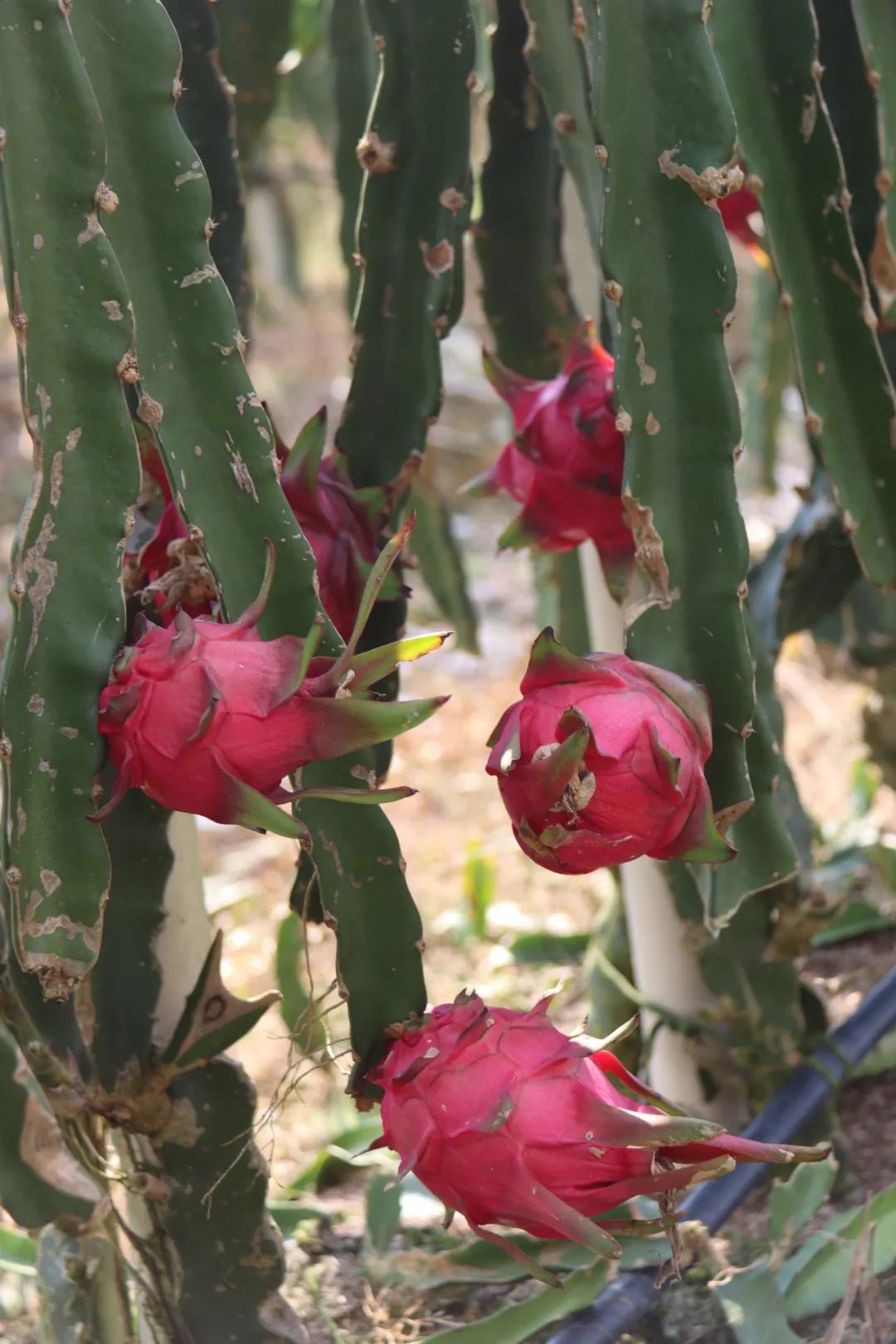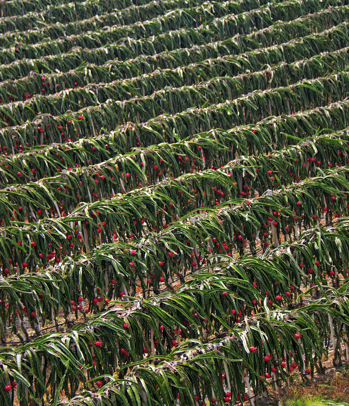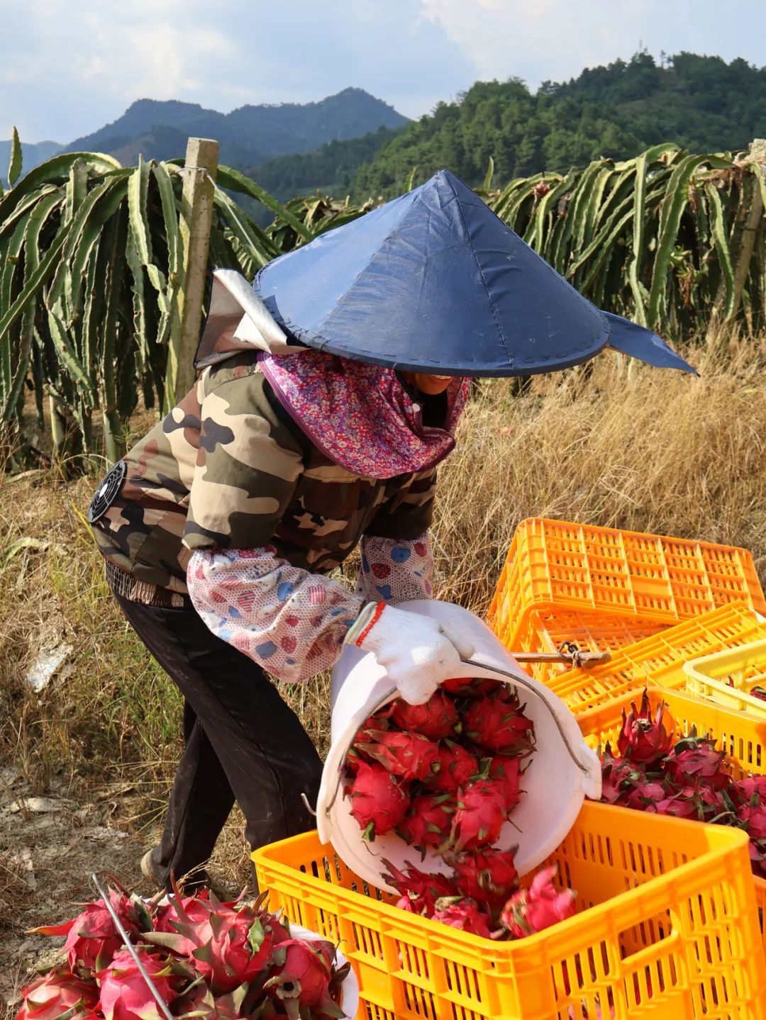全副武装的果农将火龙果一个个摘下、装箱。