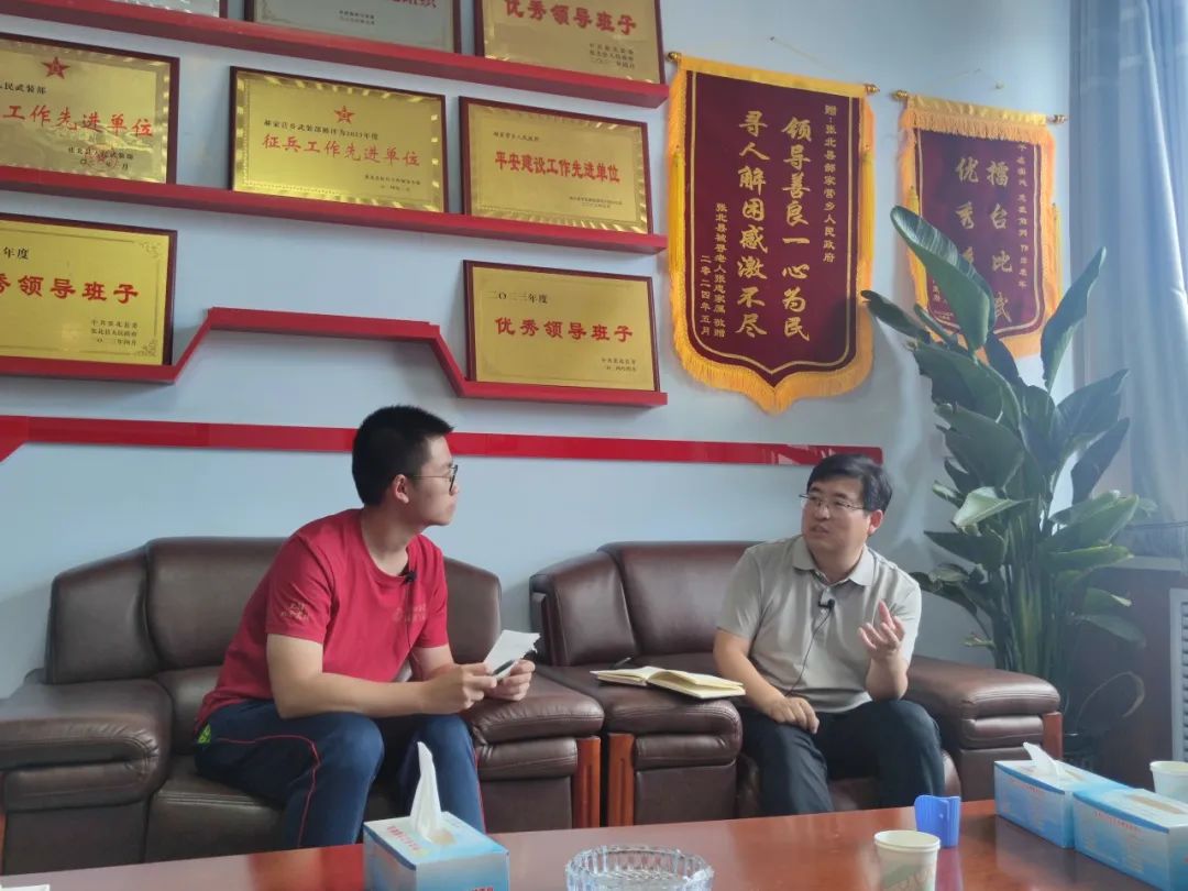 ▲太阳成tyc122cc集团本科生李政访谈郝家营乡党委书记庞建民