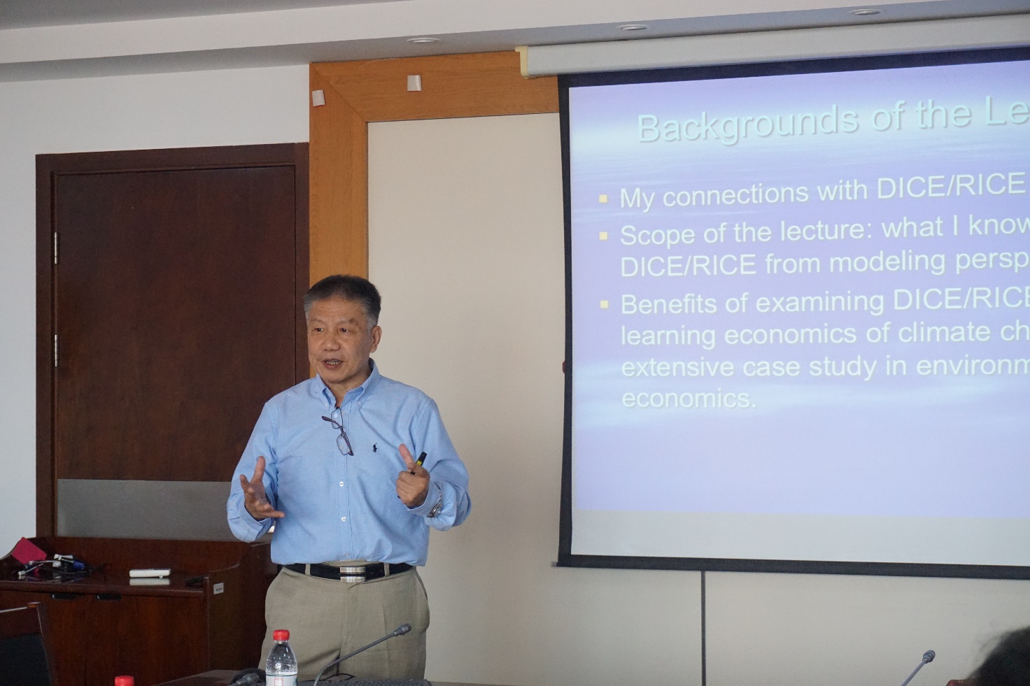 杨自力教授首先介绍了他的学术研究领域,并简要介绍了DICE(Dynamic Integrated Climate-Economy)和RICE(Regional Integrated Climate-Economy)模型的背景、所属模型类型的发展历史和在全球范围内的影响。他展示了DICE/RICE模型的内容和假设条件,并说明了其应用方向和演变轨迹,点出了DICE/RICE模型的主要区别:DICE模型是把全球看作一个区域的模型,而RICE模型是分区域模型。此外,他还介绍了环境外部性在两个模型中的体现,纳什均衡与本模型之间的联系等内容。与会师生与杨自力教授就报告内容进行了深入的交流。