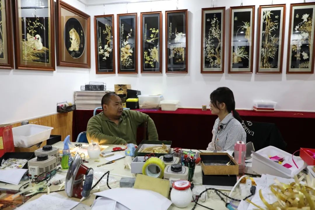 2021年,在河南省淮阳区国家级残疾人文化创业产业基地,身残志坚的脱贫户潘长江向调研团讲述自己投身芦苇画手工艺制作的感悟
