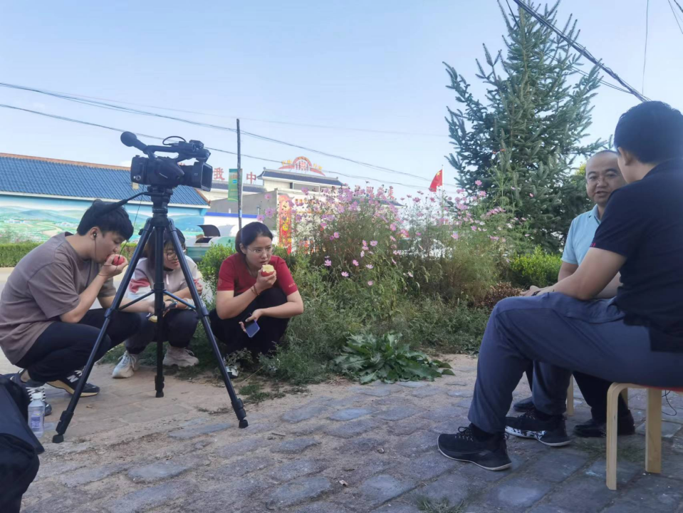 ▲调研团员工边吃当地特产苹果边旁听访谈