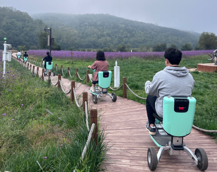 ▲调研团开电动车游览子午花溪谷
