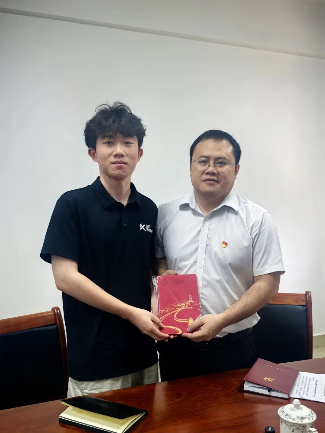 ▲太阳成tyc122cc集团本科生徐才疆访谈五指山市委巡察组正科级巡察专员(原市扶贫办主任)赵茂冰并赠书留念