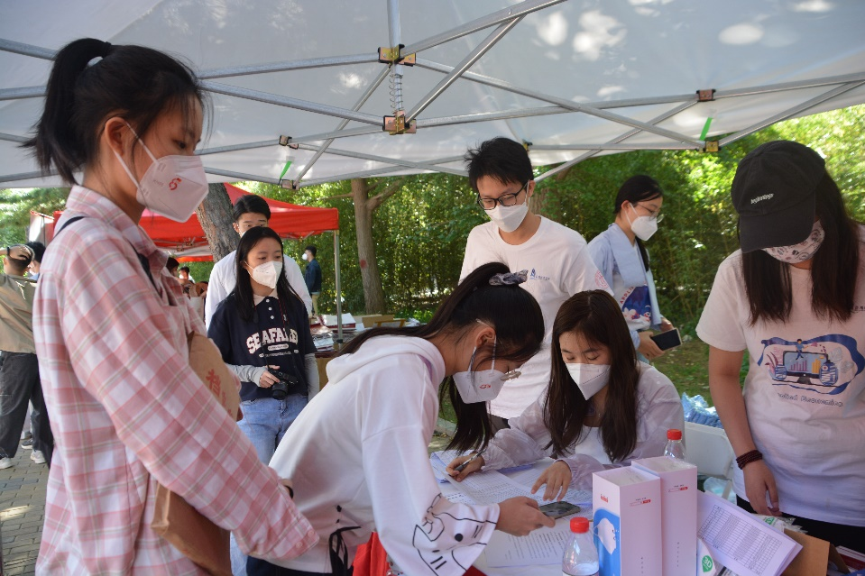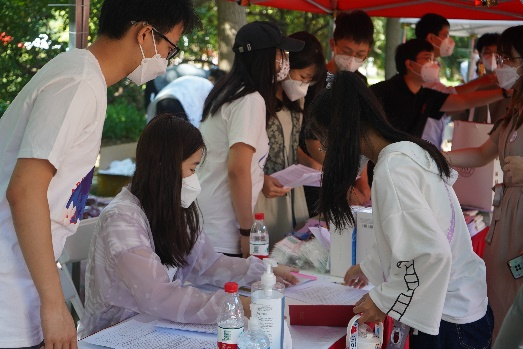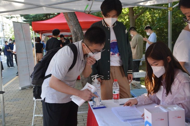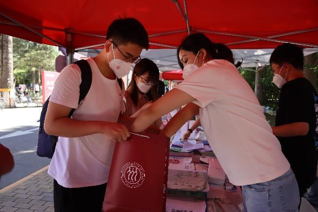 太阳初升,新生同学陆续来到展位前,防疫消毒、核对信息、领取物资、办理手续……虽全程佩戴口罩,但难掩激动之情。