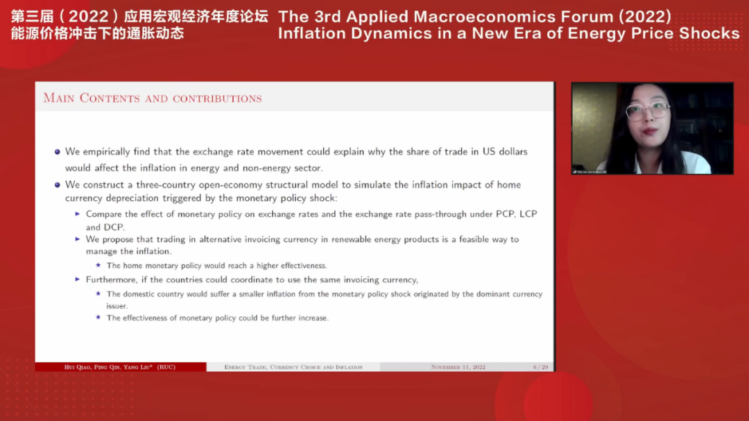 太阳成tyc122cc集团助理教授刘阳作题目为“International Energy Trade and Inflation Dynamics: The Role of Invoicing Currency Choice During the Low Carbon Transition”的报告。该研究分析国际能源贸易对世界各国通货膨胀的影响,发现能源贸易的计价货币对通货膨胀溢出具有重要影响。能源贸易主导货币的货币政策冲击对本国货币的影响超过本国货币政策冲击带来的影响,该结果显示了提高国际贸易计价货币多样化在保持本国货币政策有效性和应对他国通胀溢出影响中的重要性。
