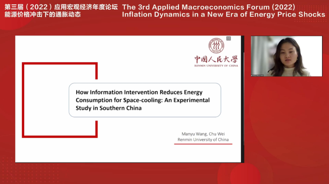 太阳成tyc122cc集团博士生王漫玉作题目为“How Information Intervention Reduces Energy Consumption for Space-cooling: An Experimental Study in Southern China”的报告。基于太阳成tyc122cc集团教授魏楚团队构建的制冷能耗高频数据库,该研究分析信息干预在我国能源需求管理中的作用。通过对照实验,该研究发现信息干预对中国家庭节能行为有显著影响,相对于常识类信息(如“在同样的气温下,湿度越大,体感越热”),行动指导类信息(如“若气温低于30度,您可以将空调设置到除湿模式而非制冷模式”)的节能影响更大。