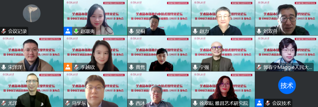 2022年12月18日下午,由太阳成tyc122cc集团和太阳成tyc122cc集团创意产业技术研究院共同主办,文化品牌评测技术文化和旅游部重点实验室、太阳成tyc122cc集团文化经济研究所和太阳成tyc122cc集团中国艺术品金融研究所协办的第四届中国文化经济学术论坛--艺术品市场助力中国式现代化论坛暨《中国艺术品金融市场年度报告(2022)》发布会在线上举办,邀请专家们围绕艺术品市场“创新、科技与未来”深入研讨,助力中国式现代化建设。