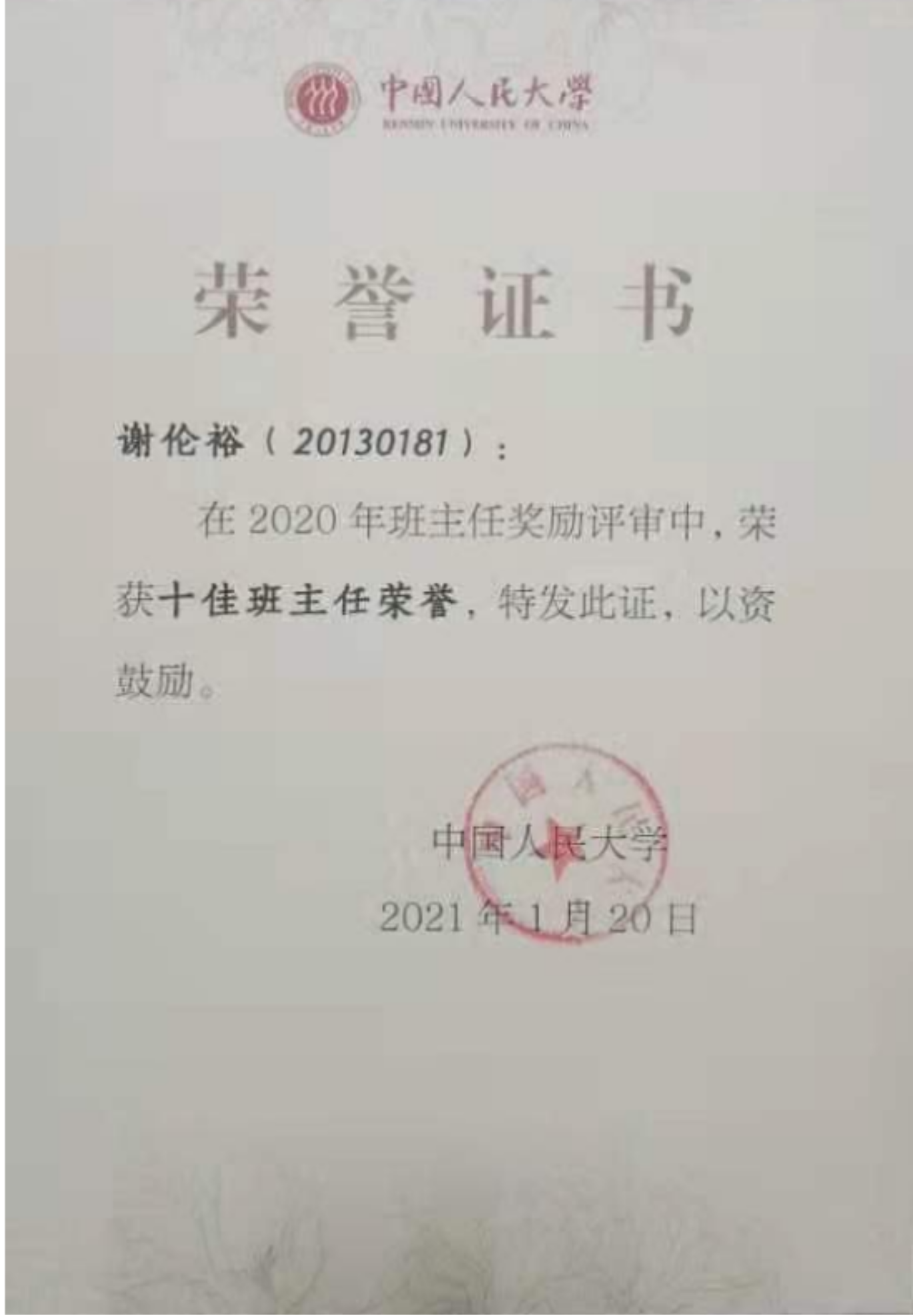 谢伦裕严格落实“立德树人”根本任务,将提升员工的“品格觉悟”摆在首位。作为班主任、新生成长导师和学术导师,她及时掌握员工思想动态,通过班会、座谈和参观等多种方式引导员工树立正确的理想信念。她关心关爱员工,及时对员工在学习生活中遇到的问题给予指导和帮助,解决了多位员工的心理问题和学业问题,2021年荣获“太阳成tyc122cc集团十佳班主任”。