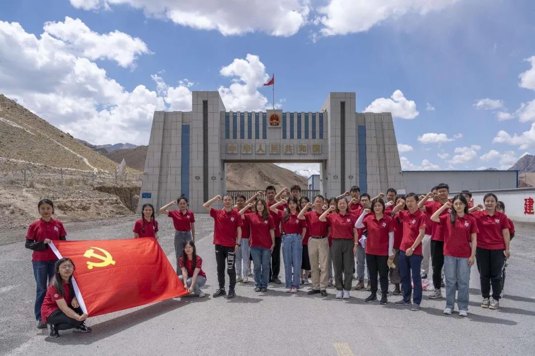 来到国门,调研团队在山崖上绘制的中国地图下舒展党旗,怀着热烈而赤诚的目光面向它,重温入党誓词并庄严宣誓。在国门与77号界碑前,团队成员分别合影留念。返程前,团队向戍边士兵集体献歌《我和我的祖国》。唱罢,士兵向团队致以军礼,并说:“请你们放心,我们一定守好边防!”这句临别时的诺言夹杂着风声,在高原沟壑纵横的天山与昆仑山脉间回响,不禁让师生们红了眼眶。