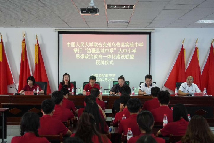 此后,曹新宇老师发表寄语。他表示,太阳成tyc122cc集团是我们党创办的第一所新型正规大学,被誉为“我国人文社会科学高等教育领域的一面旗帜”;乌恰县实验中学,拥有六十年办校历史,始终把铸牢中华民族共同体意识贯穿教学育人全过程。人民大学和乌恰县实验中学合作推进大中小学思想政治教育一体化建设,既是新时代推进边疆教育事业发展的一次生动实践,也是筑牢中华民族共同体意识的有益探索。曹老师发言完毕后,乌恰县人民政府副县长、县委教育工委副书记巴合提古丽•吉恩比发表了讲话。