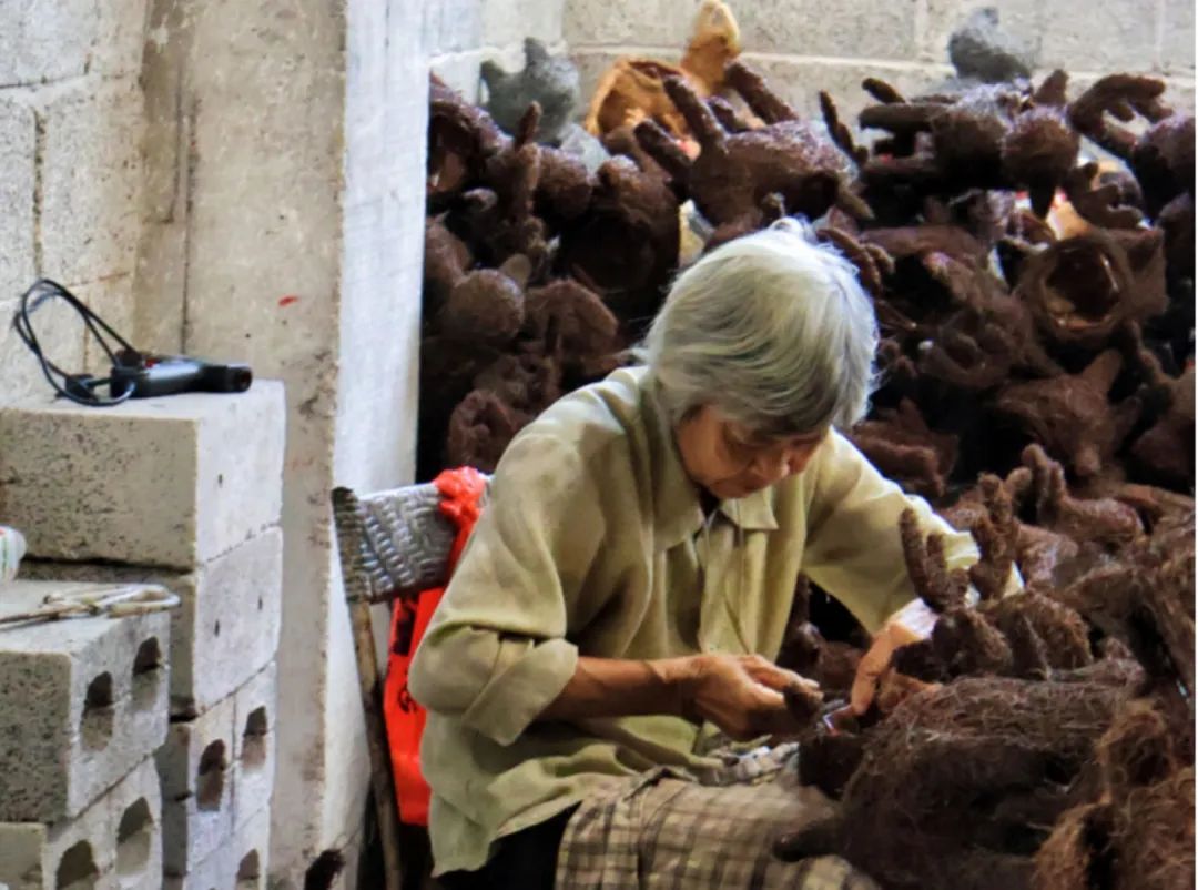▲阿婆在加工厂里专注制作藤编工艺品