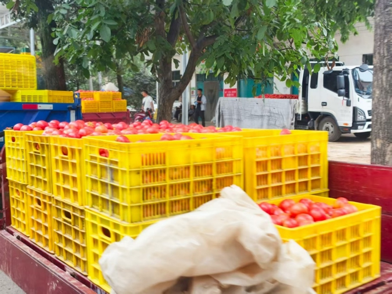 ▲铁王镇小池村村民在道路两旁售卖西红柿