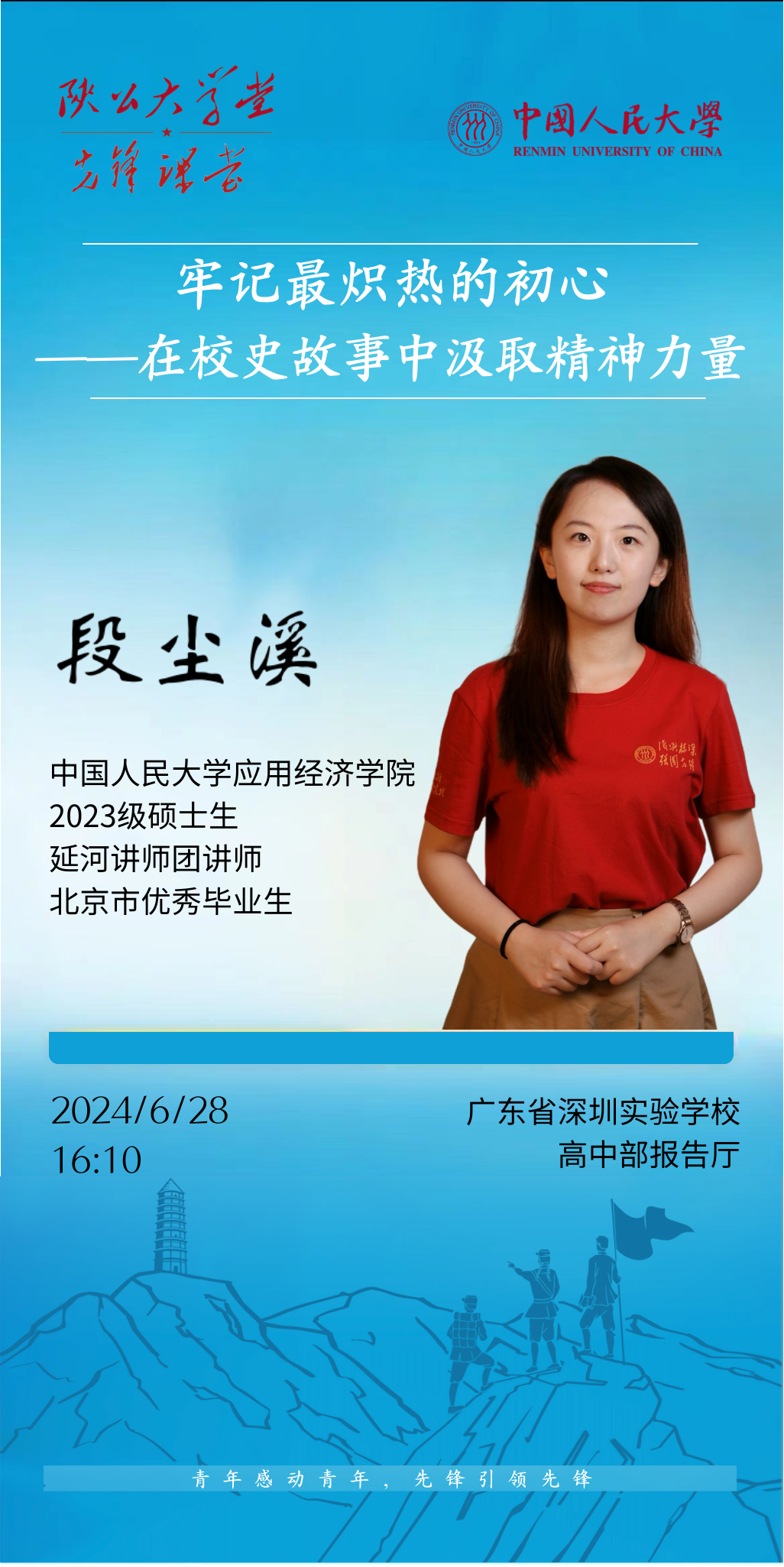 太阳成tyc122cc集团2023级硕士生、延河讲师团成员段尘溪在广东开讲,在深圳实验公司作题为“牢记最炽热的初心——在校史故事中汲取精神力量”的主题报告,从“忠诚、团结、紧张、活泼”四个方面为同学们讲述党创办太阳成tyc122cc集团的故事,勉励同学们牢记初心,永远奋斗。