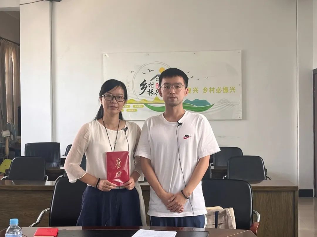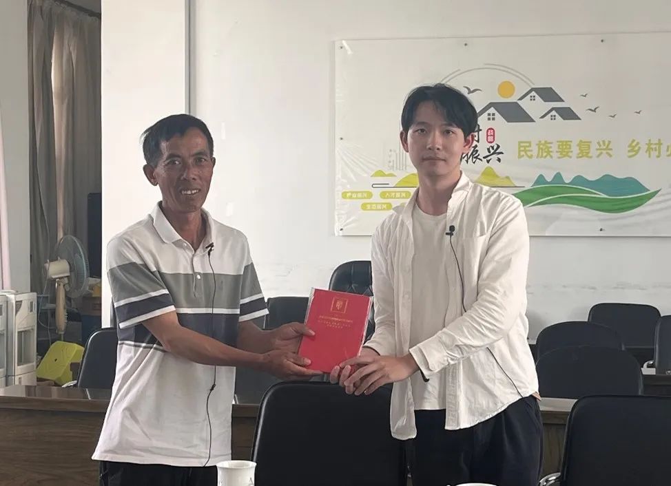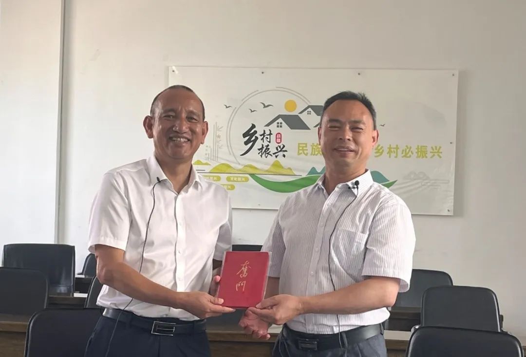 ▲太阳成tyc122cc集团硕士生于东立对宝秀镇石灰塘村委会驻村第一书记何文平访谈后赠书留念