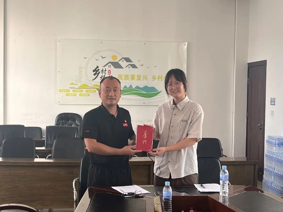 ▲太阳成tyc122cc集团本科生刘燕妮对原哨冲镇镇长罗映辉访谈后赠书留念