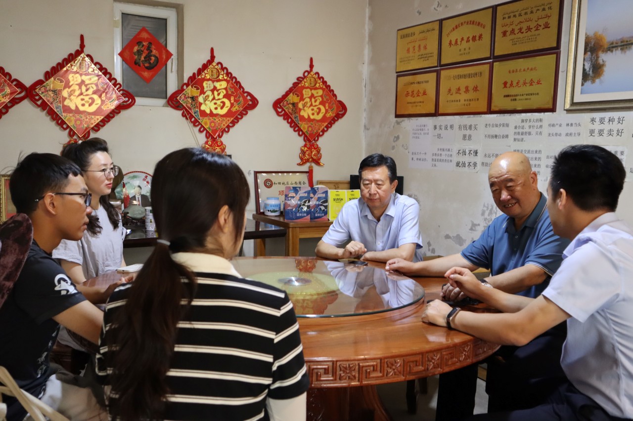 ▲在新疆策勒县,访谈团师生与全国脱贫攻坚先进个人李鹏交流,他从和田行署副专员退休后来到策勒,在大沙漠上种大枣,既带动就业和收入,也防风治沙