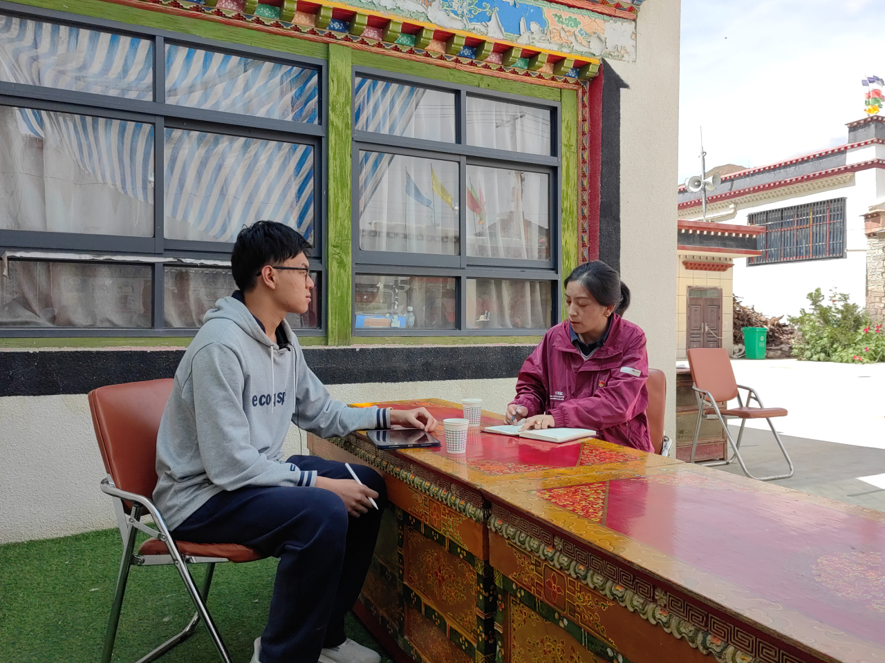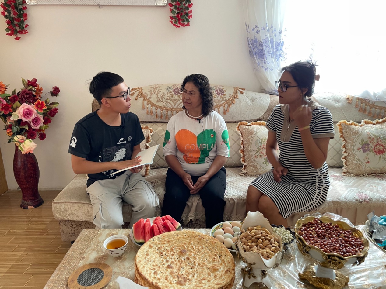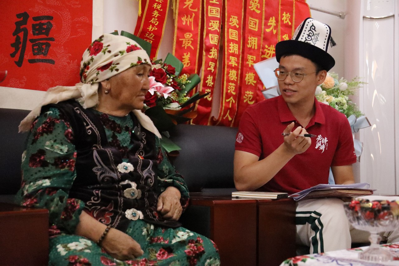 ▲在新疆克州乌恰县,博士生陈冠锟访谈手刻十多万中国石守护边境的“人民楷模”布茹玛汗·毛勒朵奶奶,该片段作为青年学子暑期参与社会实践的代表性片段在央视播出