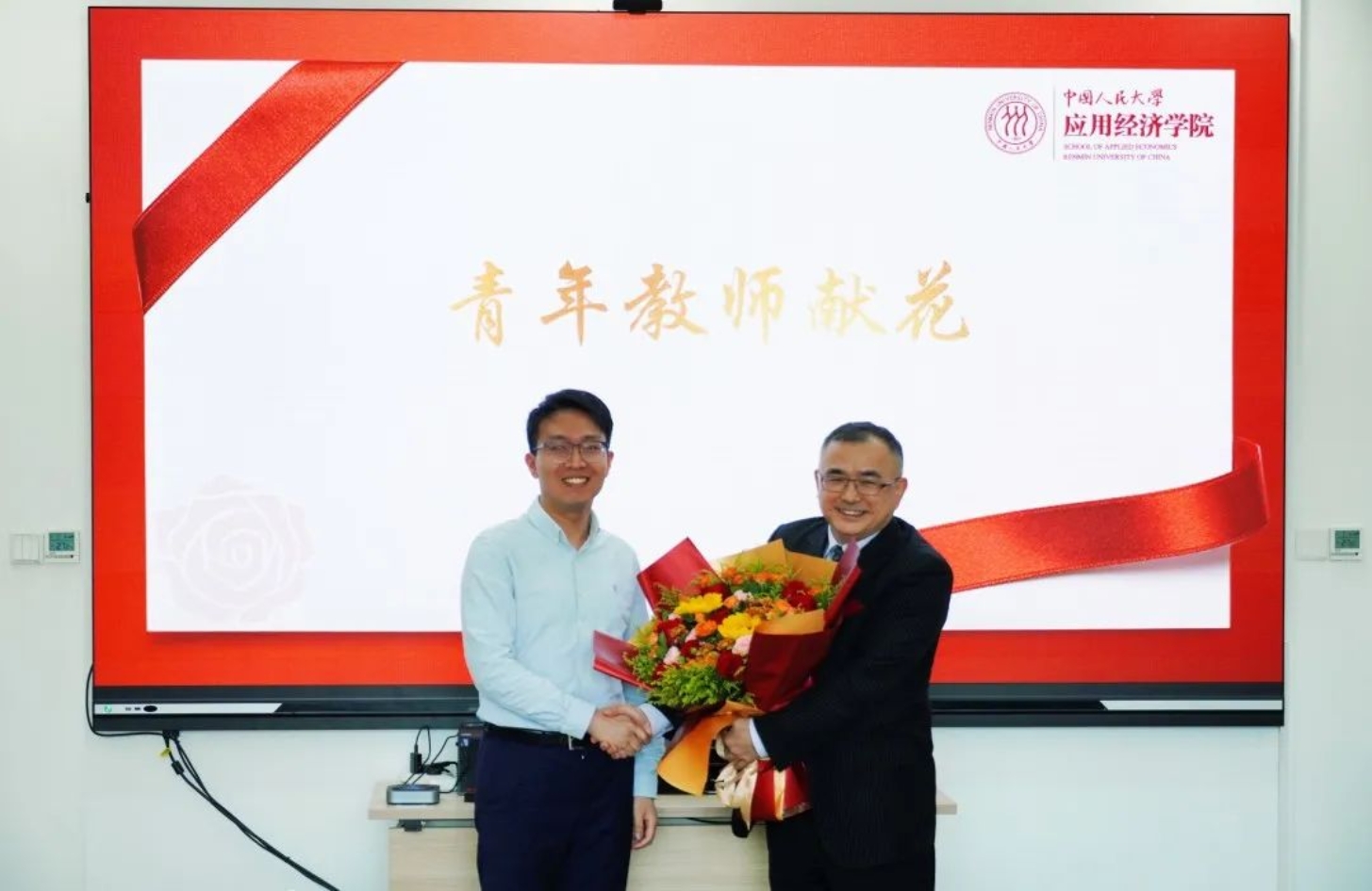 员工代表以视频形式表达了对赵老师最真挚的祝福和最深切的感恩。郑新业、宋东霞、刘瑞、林晨为赵老师赠送纪念品,青年教师吕一飞献上鲜花。
