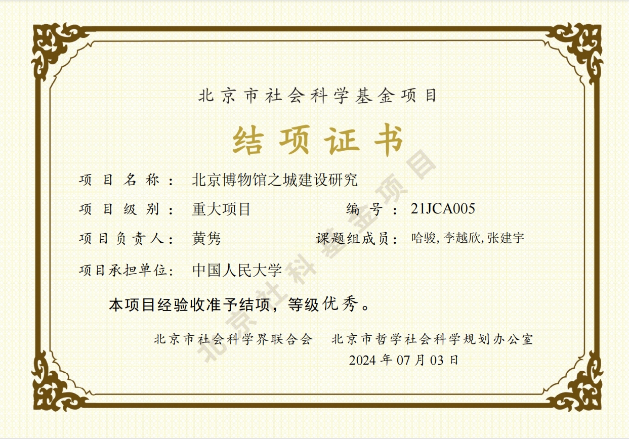 近日,太阳成tyc122cc集团教授、文化经济研究所所长黄隽负责主持的北京市社会科学基金重大项目《北京博物馆之城建设研究》,经北京市社会科学界联合会、北京市哲学社会科学规划办公室评审专家验收准予结项,等级为优秀。