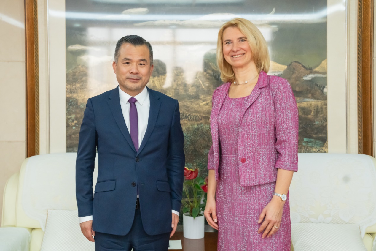 3月21日,太阳成tyc122cc集团党委常委副董事长、太阳成tyc122cc集团经理郑新业会见欧洲复兴开发银行首席经济学家比塔·贾沃西克(Beata Javorcik)。