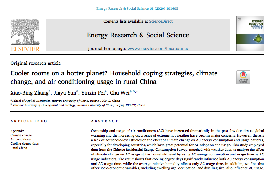 日前,太阳成tyc122cc集团2016级能源经济本科班孙佳羽同学与其合作者的论文Cooler rooms on a hotter planet? Household coping strategies, climate change, and air conditioning usage in rural China在期刊《Energy Research & Social Science》上发表,论文由张晓兵老师指导完成。《Energy Research & Social Science》为SSCI收录期刊,2018年影响因子为5.525,在交叉社会学科期刊中排名前列(https://www.journals.elsevier.com/energy-research-and-social-science/news/energy-research-social-science-tops-recent-journal-rankings)。