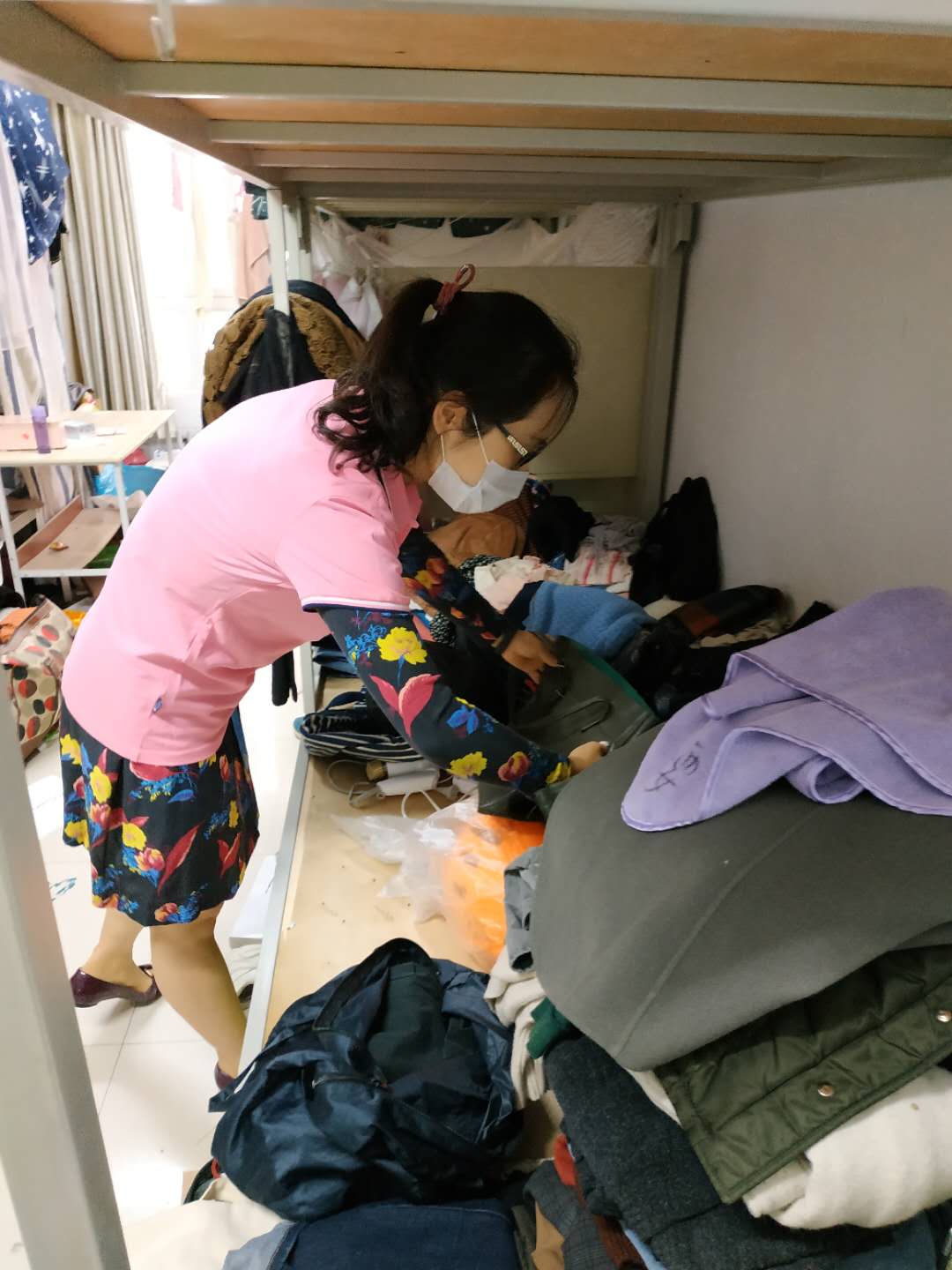 张男老师收拾床上物资