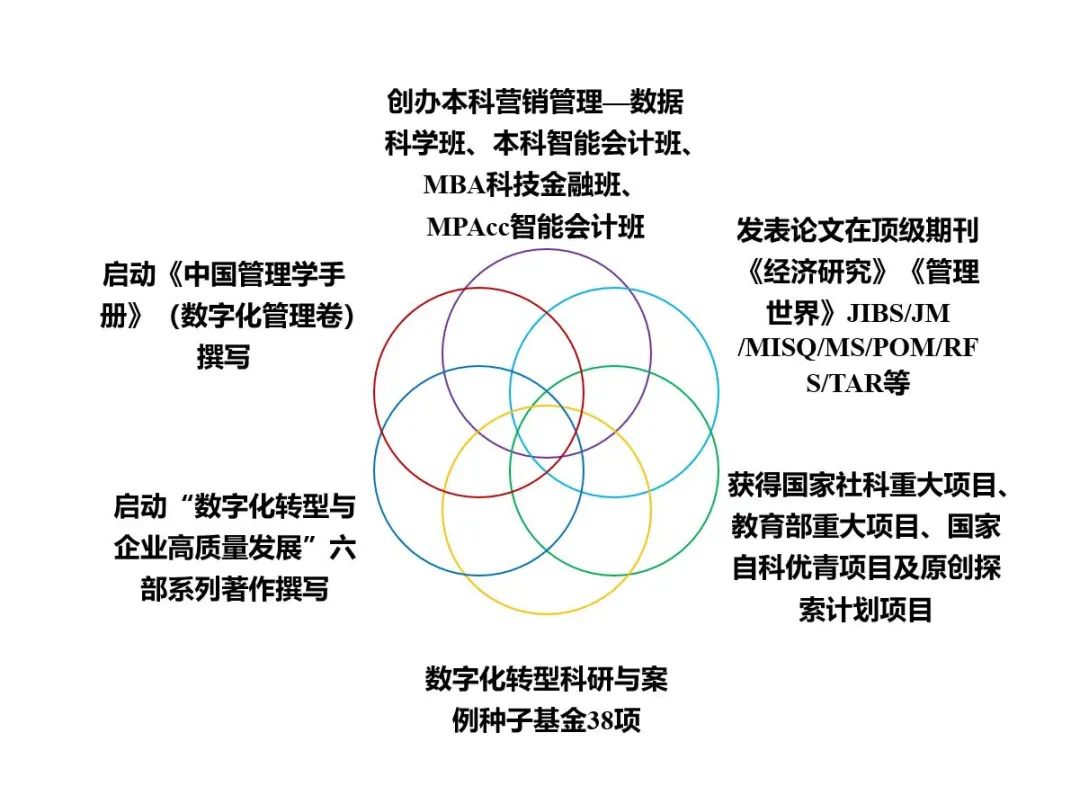 以“促进数字化转型,助力世界一流企业建设”为发展重点,引领中国工商管理在数字经济领域的学科转型。近三年资助38项数字化转型科研与案例种子基金,正在世界前沿领域持续产出重要学术成果;支持教师出版“数字化转型与企业高质量发展”系列精品著作六部;启动《中国管理学手册》(数字化管理卷)撰写;推进与多家数字化转型领先企业的人才培养、案例开发与合作研究;推出本科智能会计班与营销—数科班、MBA科技金融班、MPAcc智能会计班。
